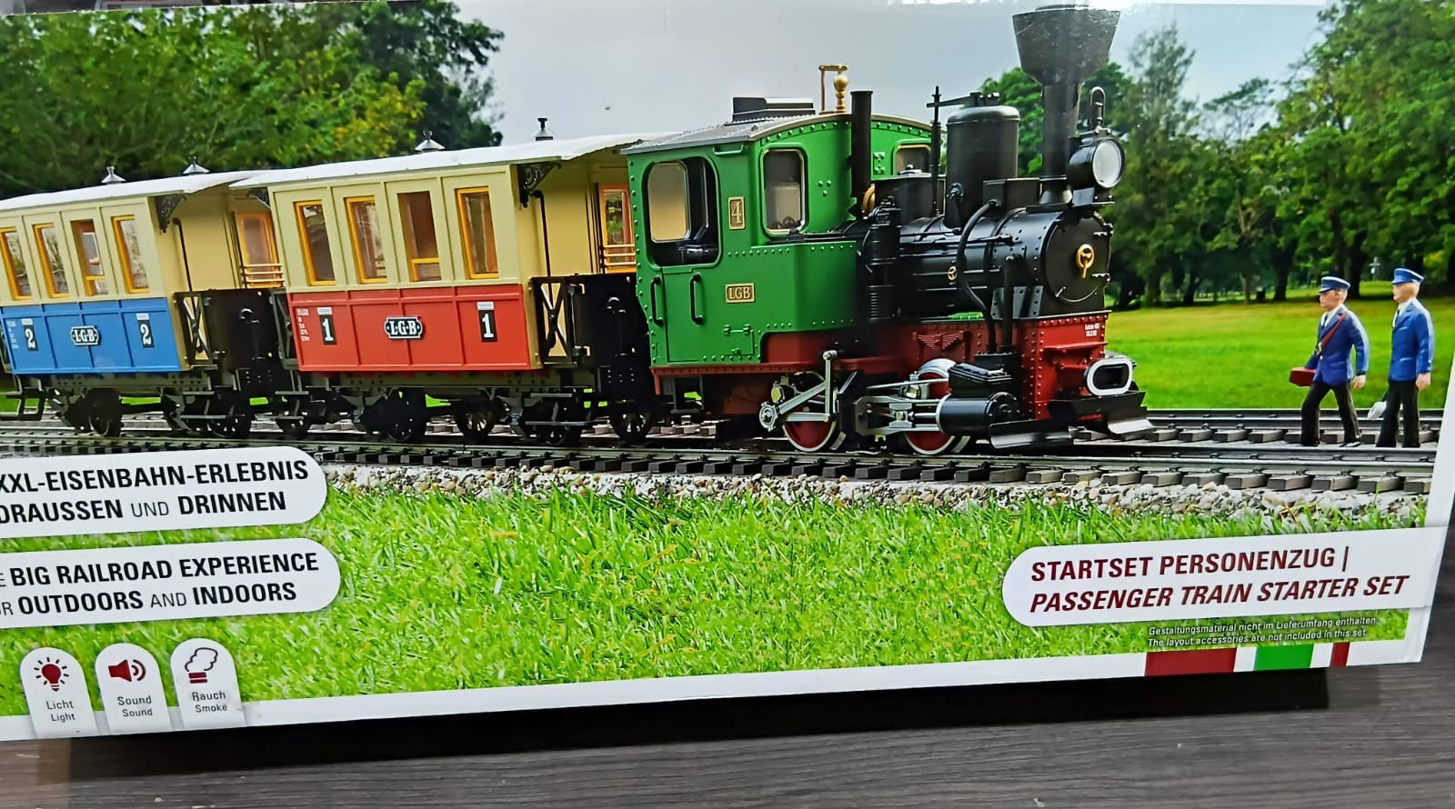 LGB 70307 PASSENGER TRAIN STARTER KIT - L70307 - MINIATURE GARDEN TRAIN WITH LOCOMOTIVE AND TWO CARS, OUTDOOR RAILWAY, G TRACK, 85 X 12 X 16 CM